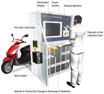 The Electric Vehicle Battery Exchange System classifies batteries as Waiting to Charge, Charging, and Charged. Users simply pay with a debit card, enter instructions on a computer screen, and insert a depleted lithium battery in exchange for a charged one. The entire process takes only a few minutes as opposed to the hours spent waiting for a battery to charge.