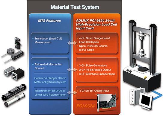 Automatic material testing aims on material quality control applications for a wide range of industries, for example: automotive, electronics, safety, fitness, leisure, medical, textile, packaging�Kand so on. A typical automatic material testing system consists of several main functions: signal conditioning, transducer excitation, transducer measurement, LVDT measurement, and actuator control to a stepper motor or hydraulic system. The system integration of all required functions normally involves multiple subsystems.