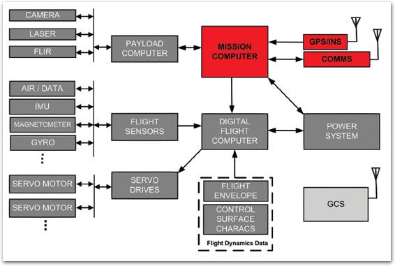 The UAV Mission Computer stores, controls, and operates the UAV. UAV operators input detailed flight plans into the mission computer, which in turn manages the flight computer to determine the path of the UAV and to control activation of the payload computer for sensor data processing.