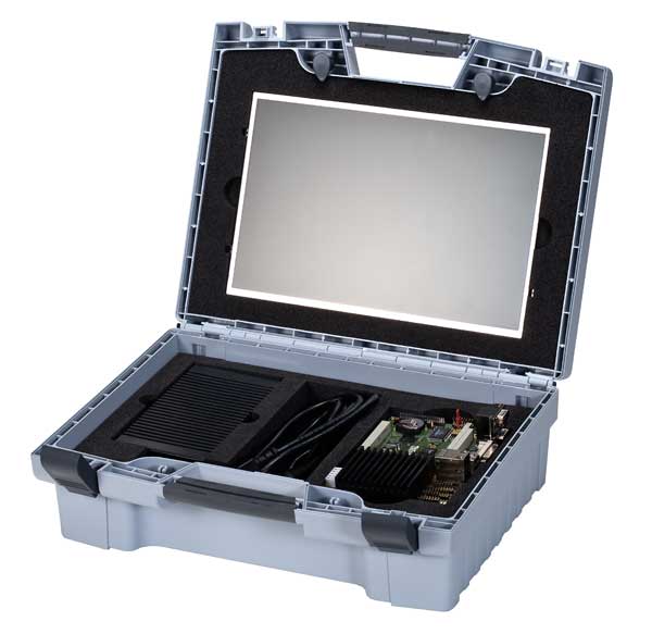 The evaluation kit comes in a sturdy carrying case and contains the CoreExpress-ECO module, mounted on a carrier board, a large 13.3" TFT display panel, all required cables and a power supply. To ease software setup, either Windows® XP or Linux? is pre-installed on the included Compact Flash disk. A complete documentation set rounds the kit off.