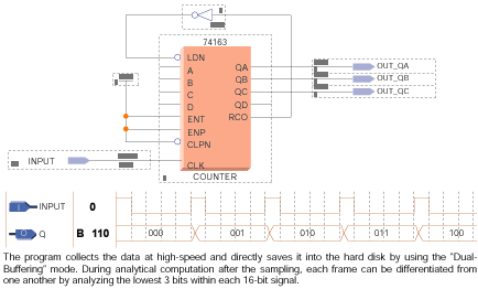 Three analog input (AI) signals available to the PCI-9812 may be sampled simultaneously. Three digital signals then combine with the 12-bit analog signal to form a 16-bit signal, which in turn is fed into the computer. On the surface level, there seem to be a synchronous relationship between the three digital signals and the AI signals.